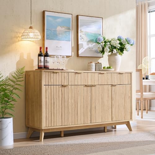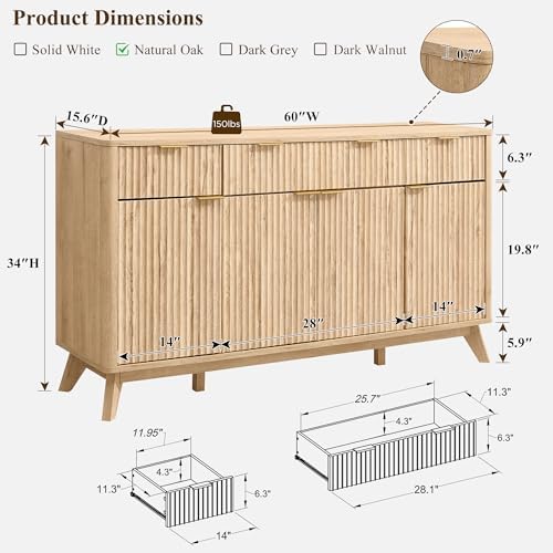 60 colių banguotas modernus bufetas su saugojimu. Ūkiškas kavos baras su trimis stalčiais ir keturiomis durimis. Aukštas kredensas valgomajam ar svetainei. Natūralus ąžuolo atspalvis koridoriui. Patvarus dizainas organizacijai. Lengva surinkti. Universalus vyno barui. Stilingas akcentas namams. Reguliuojamos lentynos viduje.
