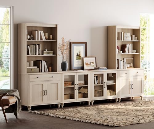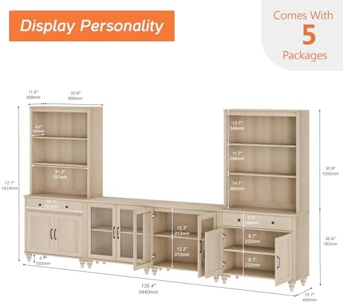 Pramogų centras TV iki 75 colių su knygų lentynomis. Ūkiškas sienos blokas su stiklinėmis durimis ir stalčiumi. Medijos konsolė svetainei ar miegamajam. Beige spalva namų teatrui. Saugojimas dekorui ir įrangai. Lengva integruoti į interjerą. Patvarus medinis rėmas. Stilingas kavos baras. Reguliuojamos lentynos.